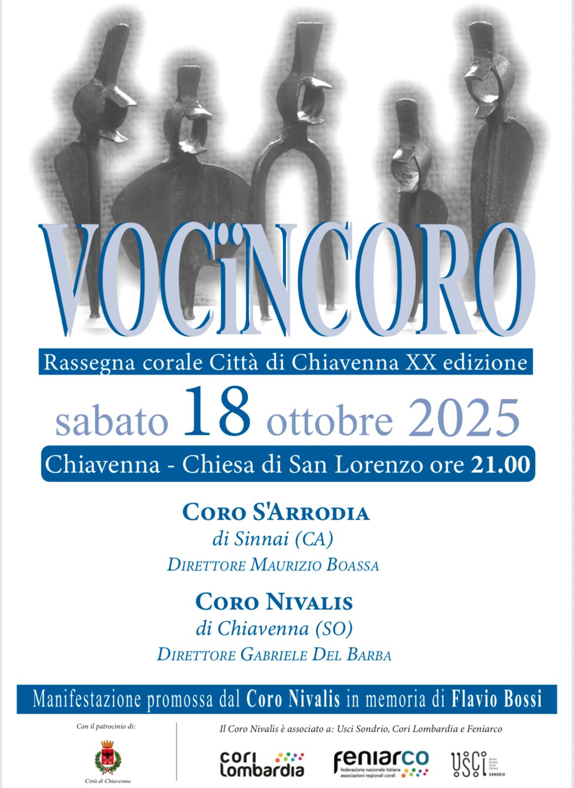 Siamo pronti ad accogliere in Valchiavenna gli amici del Coro S’arrodia di Sinnai (CA) che porteranno nel nostro territorio la tradizione corale sarda con la propria unicità di repertorio e sonorità. Vi invitiamo quindi sabato 18 ottobre alle ore 21.00 presso la chiesa di San Lorenzo a Chiavenna dove saranno protagonisti della XX edizione di Vocincoro! Un’esperienza sicuramente unica e diversa rispetto alle edizioni precedenti.